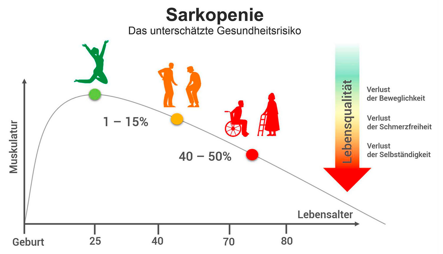 Ab etwa dem 30. Lebensjahr verlieren wir ohne gezieltes Training jedes Jahr 1–2 % Muskelmasse. Mit zunehmendem Alter beschleunigt sich dieser Prozess – mit gravierenden Folgen: