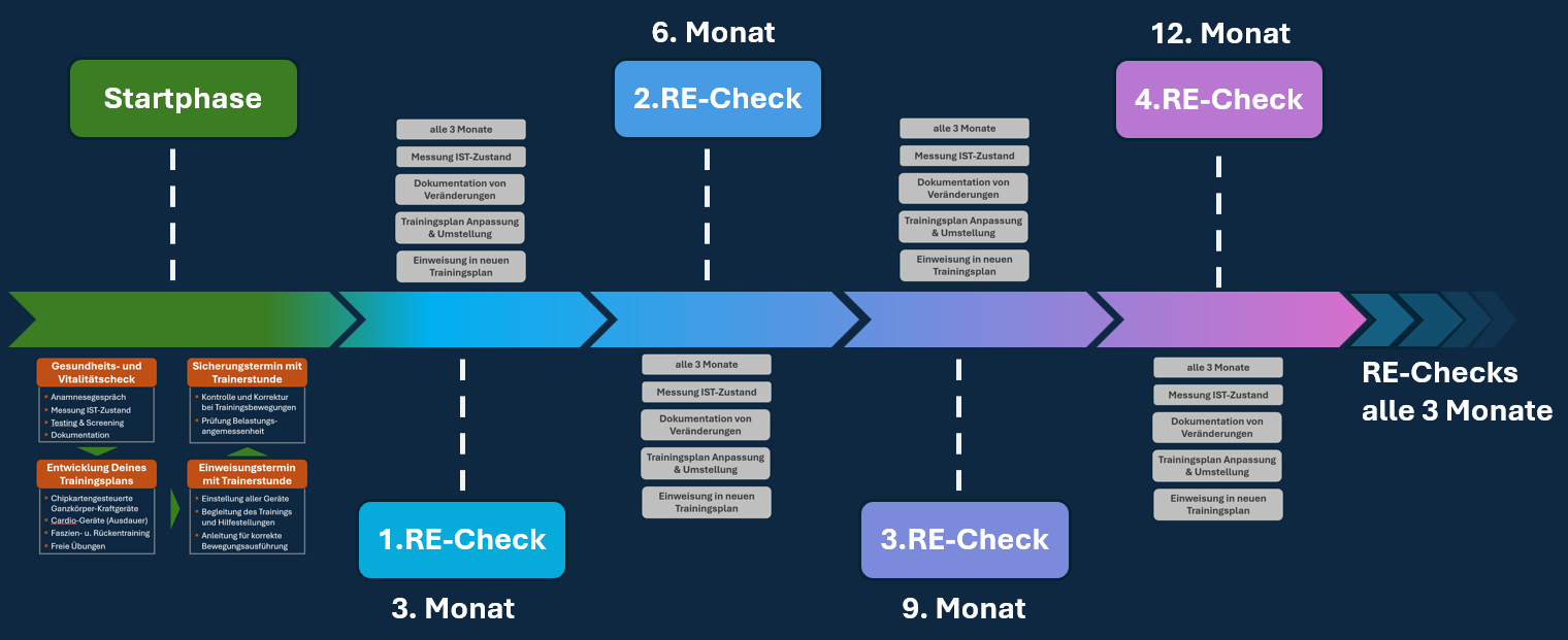 Intensive Betreuung in der Startphase Ihres Trainings. Und regelmäßige Re-Checks alle drei Monate unterstützen Dich in der Erreichung Deiner Trainings-Ziele. Für uns ist der regelmäßige Austausch und die Überprüfung Ihrer Trainingserfolge der Schlüssel für ein nachhaltiges Gesundheitstraining.